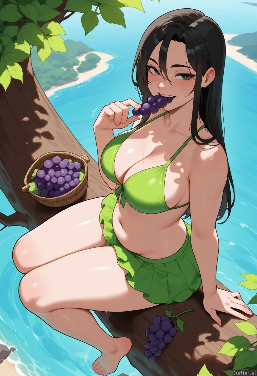 High quality, 4k, masterpiece, flawless, motion lines, side view, perfect shading, Nyantcha(artist), KAMII MOMORU(artist), Solo Adult woman, Cute sweet look, Flawless beauty, Freckles, Long black hair, Wet hair, Drunk, Flirty naughty smile, Slim chest, Slim waist, Saggy hanging thin belly, Thick thighs, Feet in water, Swim skirt, Green bikini top, Island, sea view, tropical forest, mountains, Sitting down on a fallen tree trunk, (Eating grapes high above her munching mouth:1.5)