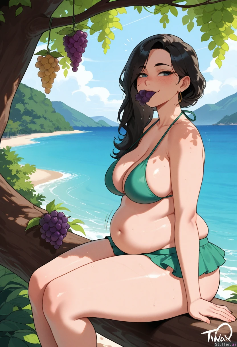 High quality, 4k, masterpiece, flawless, motion lines, side view, perfect shading, Nyantcha(artist), KAMII MOMORU(artist), Solo Adult woman, Cute sweet look, Flawless beauty, Freckles, Long black hair, Wet hair, Drunk, Flirty naughty smile, Slim chest, Slim waist, (Saggy hanging thin belly:1.5), Thick thighs, Feet in water, Swim skirt, Green bikini top, Island, sea view, tropical forest, mountains, thunderstorm in the distance, Sitting down on a fallen tree trunk, (Eating grapes high above her munching mouth:1.5)