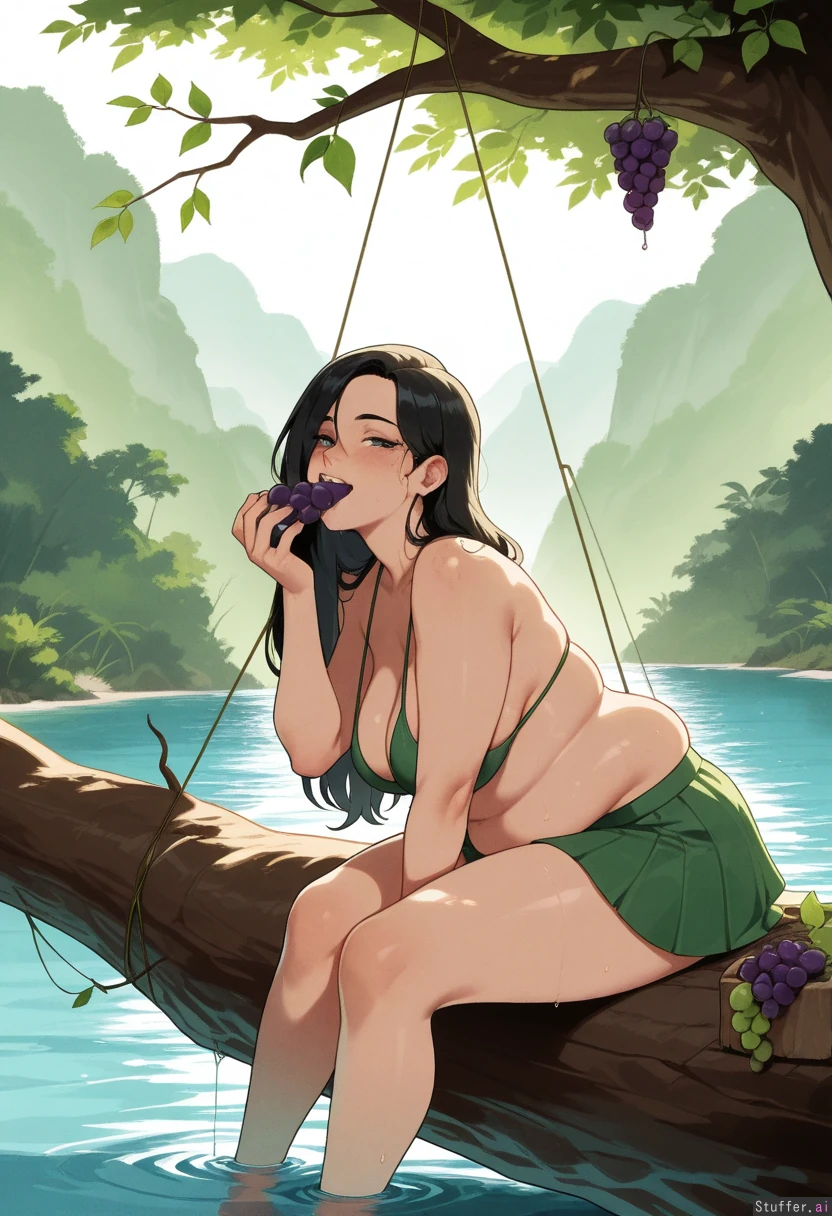 High quality, 4k, masterpiece, flawless, motion lines, side view, perfect shading, Nyantcha(artist), KAMII MOMORU(artist), Solo Adult woman, Cute sweet look, Flawless beauty, Freckles, Long black hair, Wet hair, Drunk, Flirty naughty smile, Slim chest, Slim waist, (Saggy hanging thin belly:1.5), (Overweight:1.4), Thick thighs, Feet in water, Swim skirt, Green bikini top, Island, sea view, tropical forest, mountains, thunderstorm in the distance, Sitting down on a fallen tree trunk, (Eating grapes high above her munching mouth:1.5)