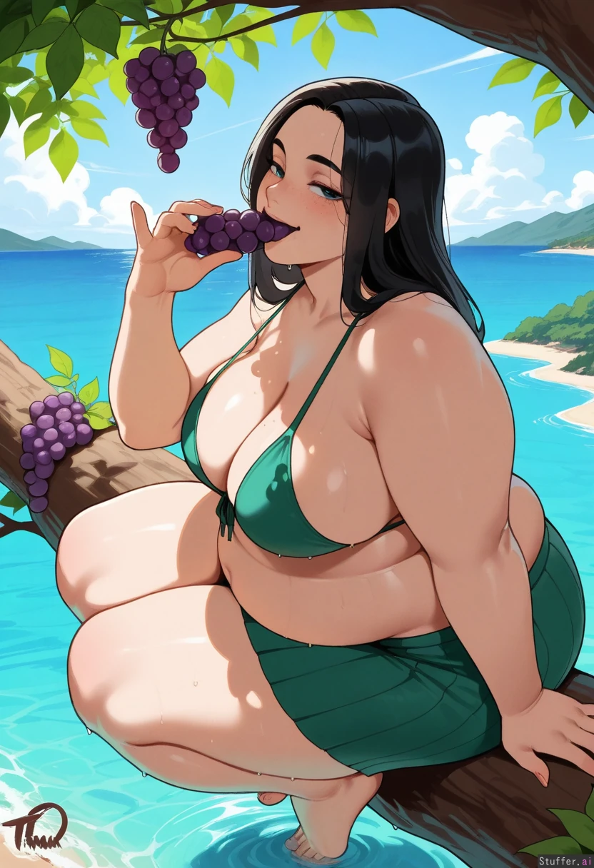 High quality, 4k, masterpiece, flawless, motion lines, side view, perfect shading, Nyantcha(artist), KAMII MOMORU(artist), Solo Adult woman, Cute sweet look, Flawless beauty, Freckles, Long black hair, Wet hair, Drunk, Flirty naughty smile, Slim chest, Slim waist, (Saggy hanging thin belly:1), (Overweight:1.7), Thick thighs, Feet in water, Swim skirt, Green bikini top, Island, sea view, tropical forest, mountains, thunderstorm in the distance, Sitting down on a fallen tree trunk, (Eating grapes high above her munching mouth:1.5)