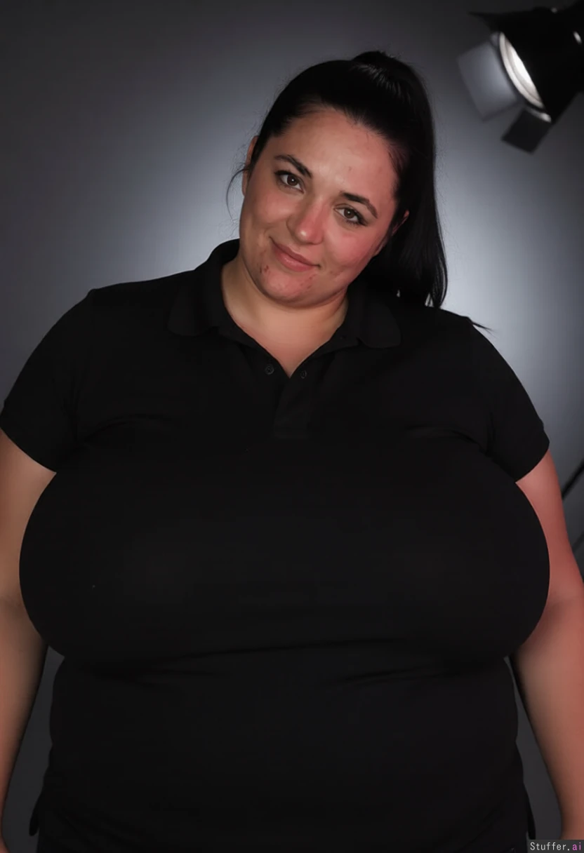 Put her in a black polo shirt, extremely obese, absurdly huge bust, ponytail,