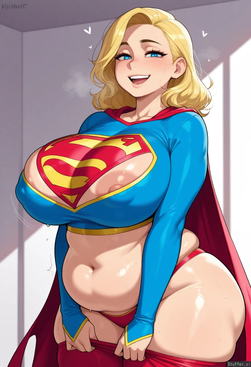 Masterpiece, best_quality, beautiful, vibrant colors, dim light, (1girl), alone,happy, smiling,bottomheavy, Masterpiece), Best_quality, perfect image, (1girl,) thick thighs, big_breasts, highly detailed, best quality, perfect anatomy, perfect lighting, per face, beautiful eyes, Krekkov (artist), KAMII MOMORU (artist), masterpiece Bloated_chubby_belly: 1.0)), ((Bottom heavy)) ((wider hips)) ((Enormous thighs)) ((Enormous asscheeks)) ((Squished together buttcheeks:1.0)) (Boob drop: 10)) ((Cellulite:1.0)) ((Sagging hips)) ((Soft huge lumpy) giant breasts, chubby belly, skindentation, plus sized, belly fat, portly, chubby, bbw,sweaty_body, moaning, ass_focus, nipple_slip, super_girl, blonde_hair, supergirl costume