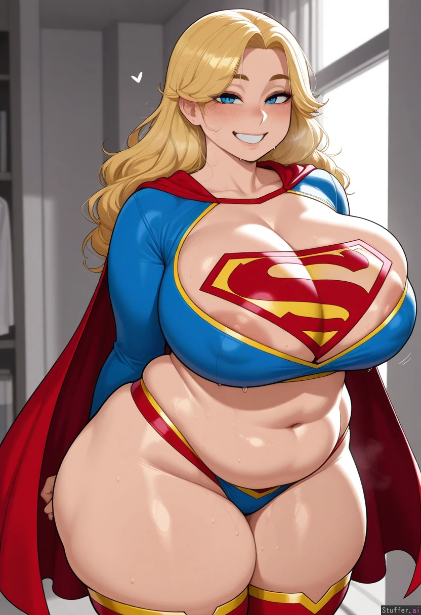 Masterpiece, best_quality, beautiful, vibrant colors, dim light, (1girl), alone,happy, smiling,bottomheavy, Masterpiece), Best_quality, perfect image, (1girl,) thick thighs, big_breasts, highly detailed, best quality, perfect anatomy, perfect lighting, per face, beautiful eyes, Krekkov (artist), KAMII MOMORU (artist), masterpiece Bloated_chubby_belly: 1.0)), ((Bottom heavy)) ((wider hips)) ((Enormous thighs)) ((Enormous asscheeks)) ((Squished together buttcheeks:1.0)) (Boob drop: 10)) ((Cellulite:1.0)) ((Sagging hips)) ((Soft huge lumpy) giant breasts, chubby belly, skindentation, plus sized, belly fat, portly, chubby, bbw,sweaty_body, moaning, ass_focus, nipple_slip, super_girl, blonde_hair, supergirl costume, ass_focus