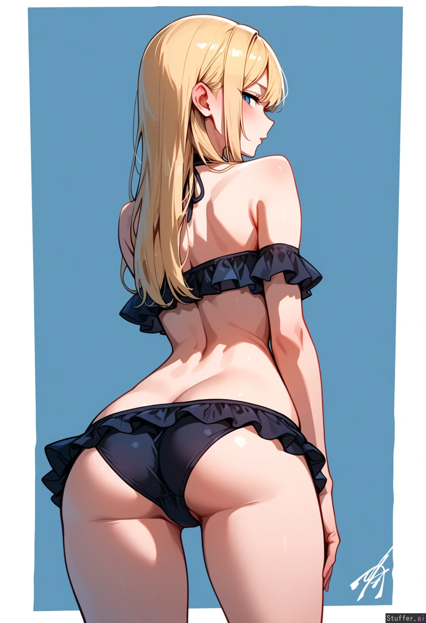 masterpiece, best quality, 1girl, (huge_ass:1.6), (round_ass:1.4), (protruding_ass:1.3), (big_buttocks:1.4), (small_hips:1.2), narrow_hips, (skinny_legs:1.5), (thin_thighs:1.4), skinny, slender, (exaggerated:1.3), disproportionate, anatomical_nonsense, looking_back, blonde_hair, frilly bikini
