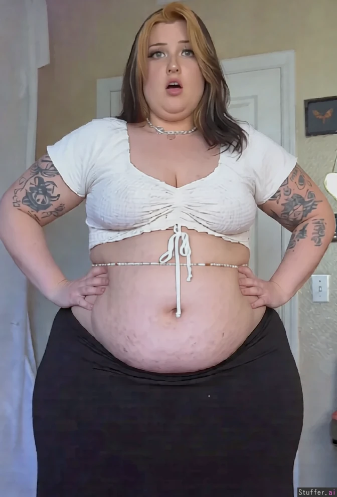 Make her even more morbidly obese . Obese arms. Bigger rounder belly. Wider hips. Obese forearms. Deeper bigger cleavage. Tighter clothes.