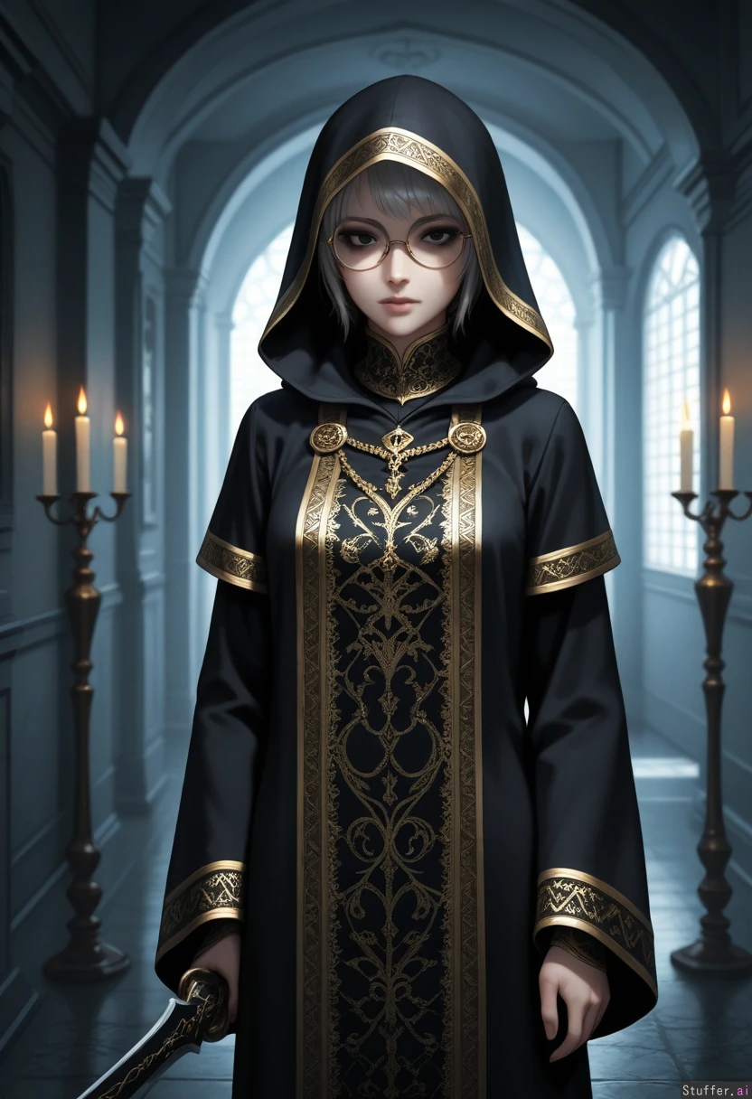 A young woman standing in a dim, atmospheric setting, wearing a dark navy hooded robe with golden embroidered patterns of eyes and suns along the sleeves. The robe is elegant yet slightly worn, with a soft inner dark lining. She is in the middle of removing a white mask, holding it in one hand near her face. The mask has a simple design with a black triangle in the center. She has short gray hair cut to jaw length, slightly messy, pale skin, visible dark circles under her eyes, and deep black eyes that give off a calm but tired expression. Her face is soft with a delicate nose and full lips. Her body is slim with a subtle hourglass figure. She wears round glasses slightly lowered on her nose. The lighting is soft and cinematic, slightly from the side, creating shadows that enhance the mysterious mood. Background is blurred, possibly an abandoned building or ritual room with candles faintly glowing. Mood: mysterious, calm, introspective, slightly melancholic.