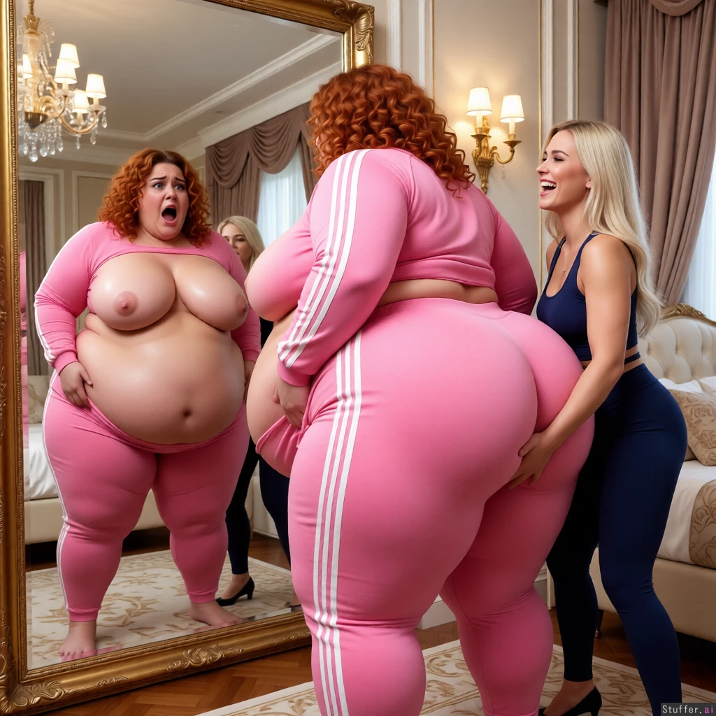 beautiful hyper obese ssbbw blob, pink tracksuit, scared, luxury bedroom, enormously saggy wide lower hyper belly that hangs to her knees, enormous wide round hips, enormous fat saggy arms, massive heavy hanging breasts, massive thick chunky thighs, massive thick protruding flabby chunky ass cheeks, curly ginger, assisted by grinning blonde bimbo who is standing behind her grabbing at her ass, looking into a mirror, back side view