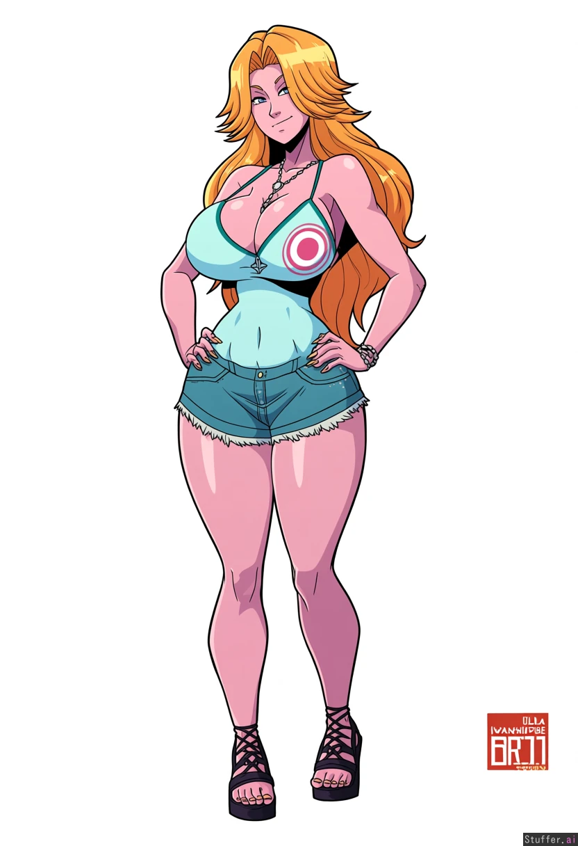 masterpiece, ultra detail, vanripper(artist), full body, Yordle Matsumoto Rangiku, (((light pink skin))), pointy ears, Looking at viewer, hands_on_hips, big_belly, sundress, short,