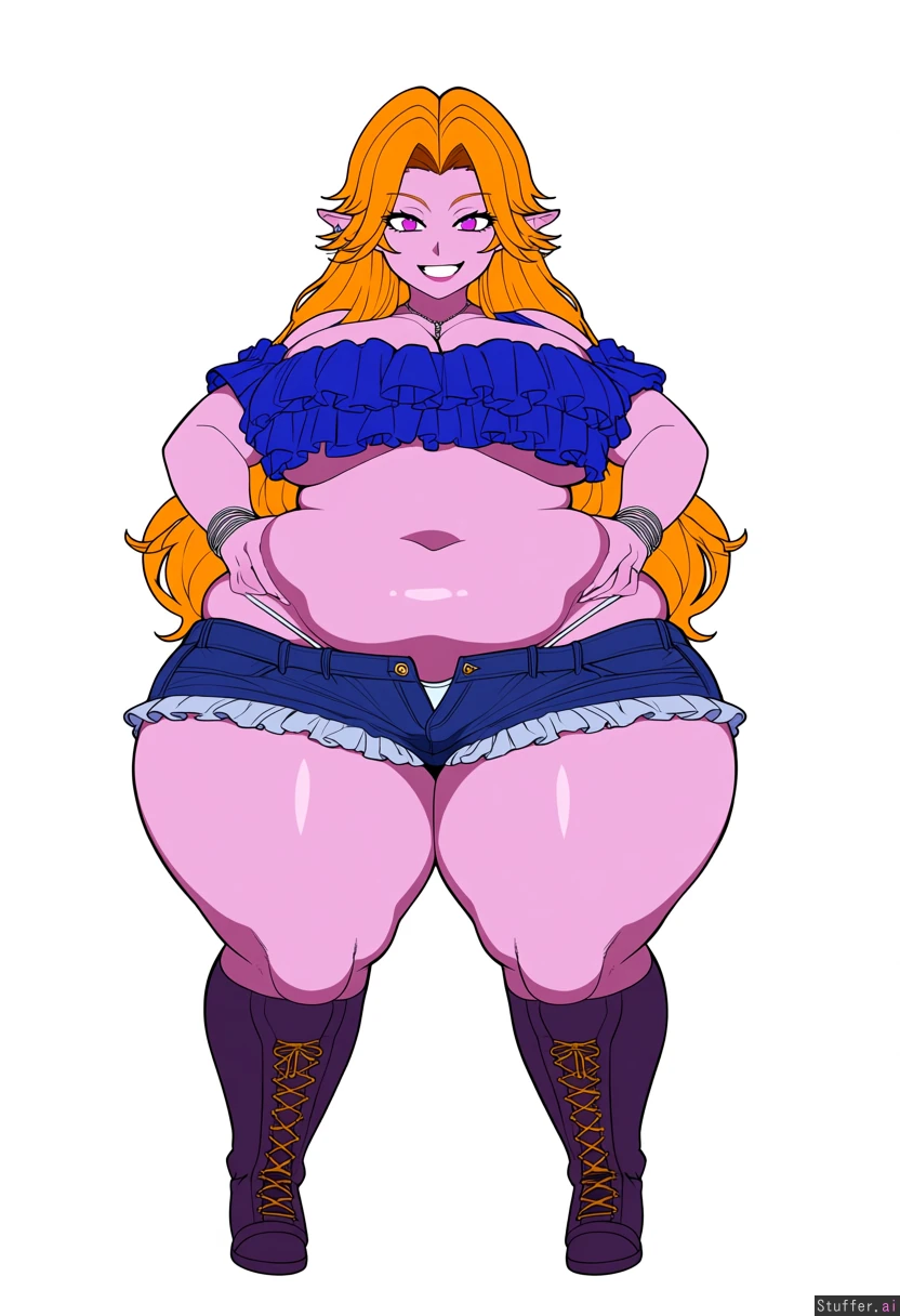 masterpiece, ultra detail, flat color, full body, Yordle Matsumoto Rangiku, (((light pink skin))), pointy ears, yordle female, chubby Looking at viewer, hands_on_hips, big_belly, frilly croptop, panties, short,