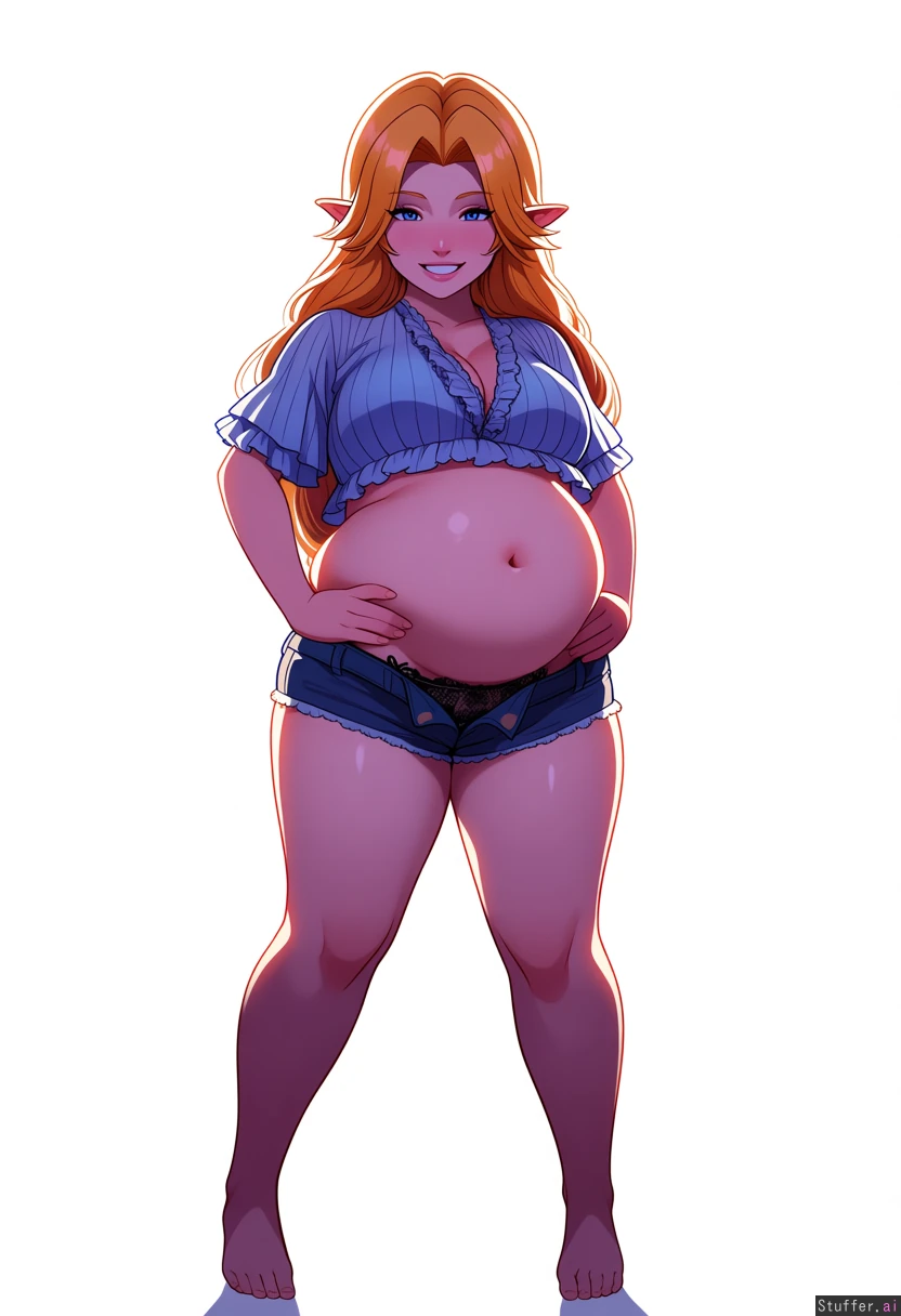 masterpiece, ultra detail, high quality, highly detailed, soft lighting, full body, Yordle Matsumoto Rangiku, (light pink skin), pointy ears, yordle female, Looking at viewer, hands_on_hips, big chubby belly, frilly croptop, lace panties, short, cute, beautiful, smiling, white_background, bare_legs, petite,