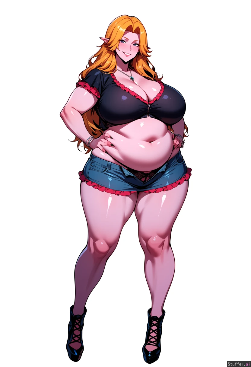 masterpiece, ultra detail, high quality, highly detailed, full body, Yordle Matsumoto Rangiku, (light pink skin), pointy ears, yordle female, Looking at viewer, hands_on_hips, big chubby belly, frilly croptop, lace panties, short, cute, beautiful, smiling, white_background, bare_legs,