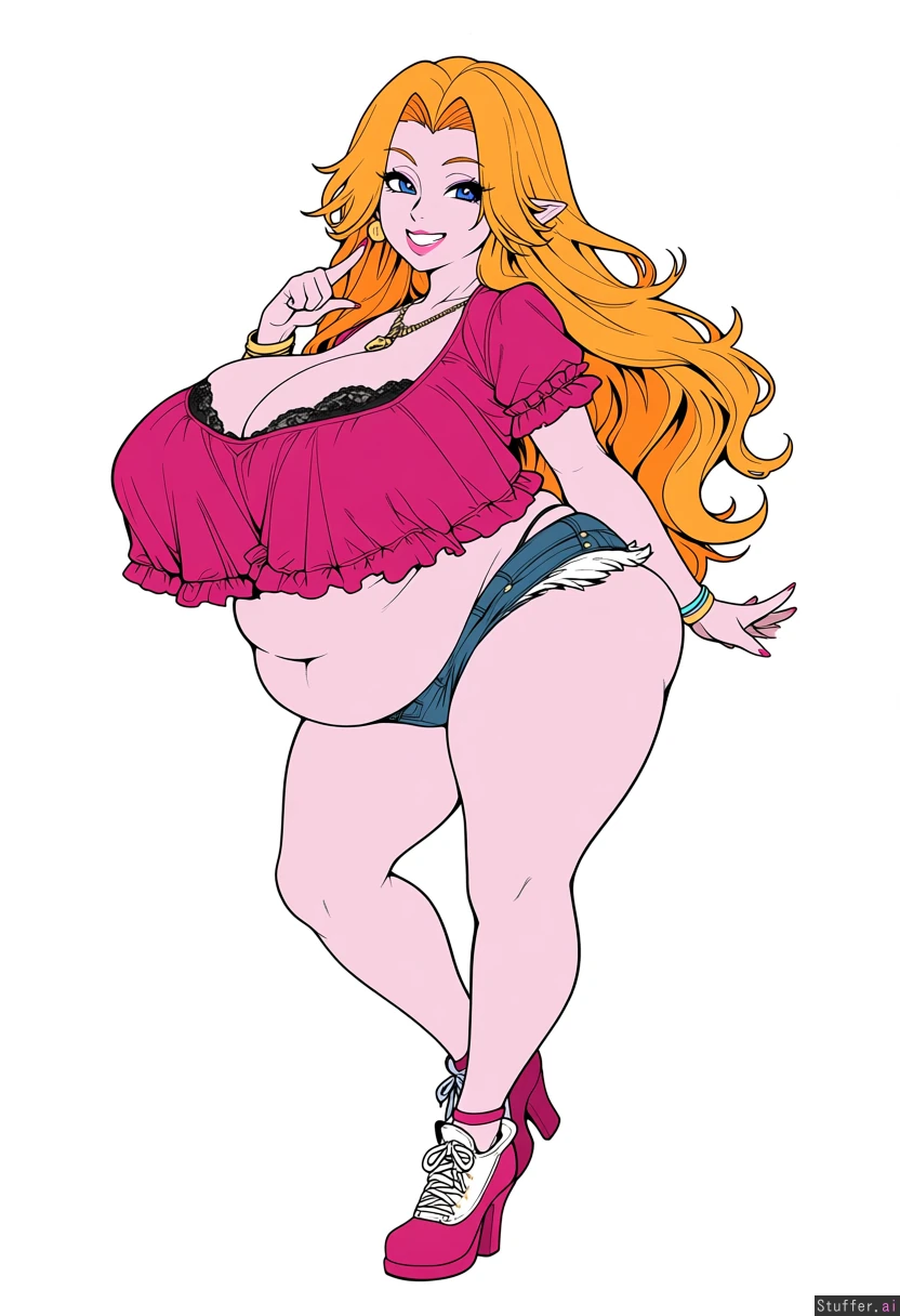 masterpiece, ultra detail, flat color, full body, cartoony, Yordle Matsumoto Rangiku, (light pink skin), pointy ears, yordle female, Looking at viewer, big chubby belly, frilly croptop, lace panties, short, cute, beautiful, smiling, white_background, bare_legs, big eyes