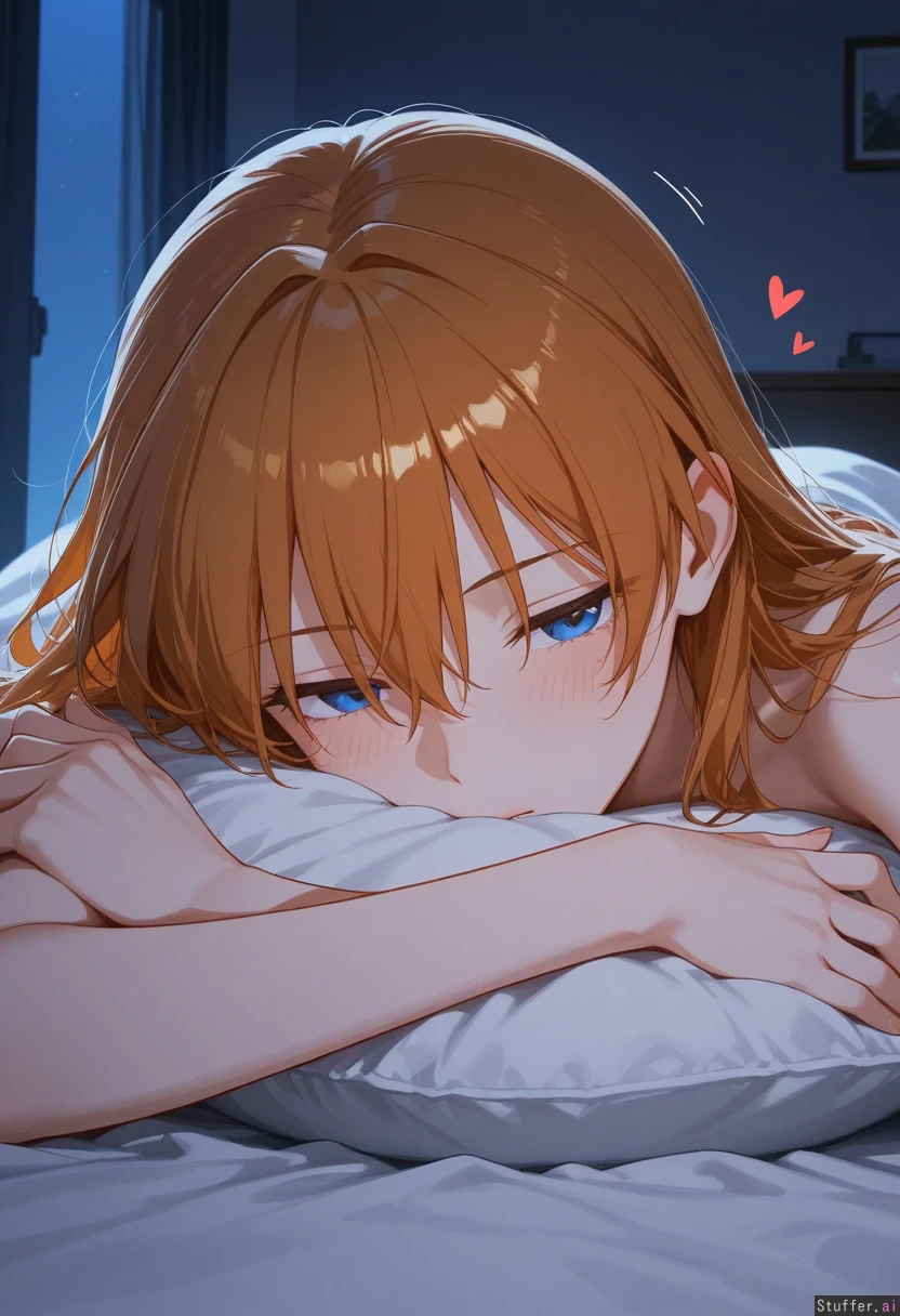 Detailed Background, (Masterpiece), Best_quality, intricate_detail, perfect image, (heart), effect, motion lines, pure,bed,dark,night, (1woman,queen,(mature,provocative,queen-style:1.5), solo,detailed face,detailed eyes,((((Asuka langley,((no headwear, no original hairstyle, no default hair style)),straight hair,loose hair,(so hot figure:1.51),eyes half closed,looking at viewer), naked,on bed,