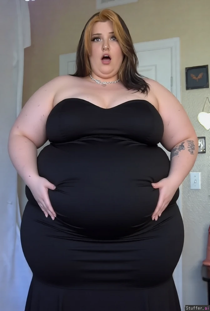 Turn her into a massive fat stuffed blob with fat rolls spilling out and a gigantic soft distended double_fold_belly massive fat thick thighs and hips and ass, give her breasts a engorged full look, give her massive round lovehandles, make her fatter than morbidly_obese make her over 600 pounds, unrealistically massive and fat proportions, make her to morbidly_obese_overweight_fat to fit in frame, make her fat massive belly stick out from body so it overhangs and fills her lap, fat soft double_fold_belly filling out the space between her thighs, give her a fat massive round butt, make her shoulders, very_raise her massive stuffed stomach, make her arms and neck fat.. chubby face. Fat wrists. Fat hands. Fat forearms. Smooth soft skin. Smooth belly.. wearing a black prom dress