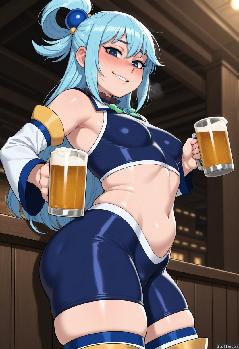 (Krekkov (artist), KAMII MOMORU(artist), KipTeiTei(artist), Vale-City(artist)), beautiful shading, highly detailed, best quality, perfect anatomy, perfect proportions, perfect lighting, solo, ((Aqua from Konosuba)), horny, ((tight clothes)), ((alt girl)), ((thick, potbelly:0.0)),((drunk:0.79)), (blushing face), (sexy pose, sexy), thick thighs, shy, round belly, standing, on a bar, drinking beer, night, small breasts, erect nipples under clothing, side view, (1flatchest_adult), Dramatic lighting, ((looking down))