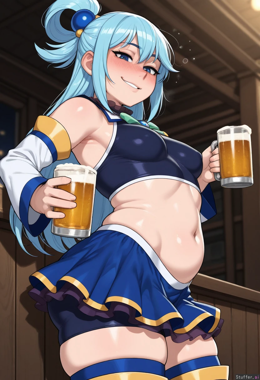 (Krekkov (artist), KAMII MOMORU(artist), KipTeiTei(artist), Vale-City(artist)), beautiful shading, highly detailed, best quality, perfect anatomy, perfect proportions, perfect lighting, solo, ((Aqua from Konosuba)), horny, ((tight clothes)), ((alt girl)), ((thick, potbelly:0.95)),((drunk:1.25)), (blushing face), (sexy pose, sexy), thick thighs, shy, round belly, standing, on a bar, drinking beer, night, small breasts, erect nipples under clothing, side view, (1flatchest_adult), Dramatic lighting, ((looking down))