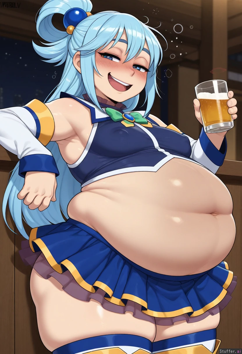 (Krekkov (artist), KAMII MOMORU(artist), KipTeiTei(artist), Vale-City(artist)), beautiful shading, highly detailed, best quality, perfect anatomy, perfect proportions, perfect lighting, solo, ((Aqua from Konosuba)), horny, ((tight clothes)), ((alt girl)), ((thick, potbelly:1.94)),((drunk:1.79)), (blushing face), (sexy pose, sexy), thick thighs, shy, round belly, standing, on a bar, drinking beer, night, small breasts, erect nipples under clothing, side view, (1flatchest_adult), Dramatic lighting, ((looking down))