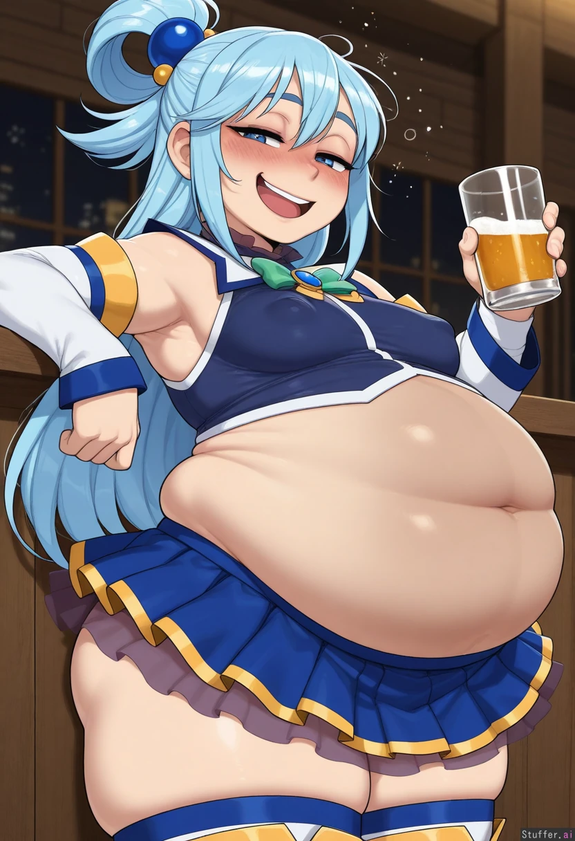 (Krekkov (artist), KAMII MOMORU(artist), KipTeiTei(artist), Vale-City(artist)), beautiful shading, highly detailed, best quality, perfect anatomy, perfect proportions, perfect lighting, solo, ((Aqua from Konosuba)), horny, ((tight clothes)), ((alt girl)), ((thick, potbelly:1.99)),((drunk:1.79)), (blushing face), (sexy pose, sexy), thick thighs, shy, round belly, standing, on a bar, drinking beer, night, small breasts, erect nipples under clothing, side view, (1flatchest_adult), Dramatic lighting, ((looking down))