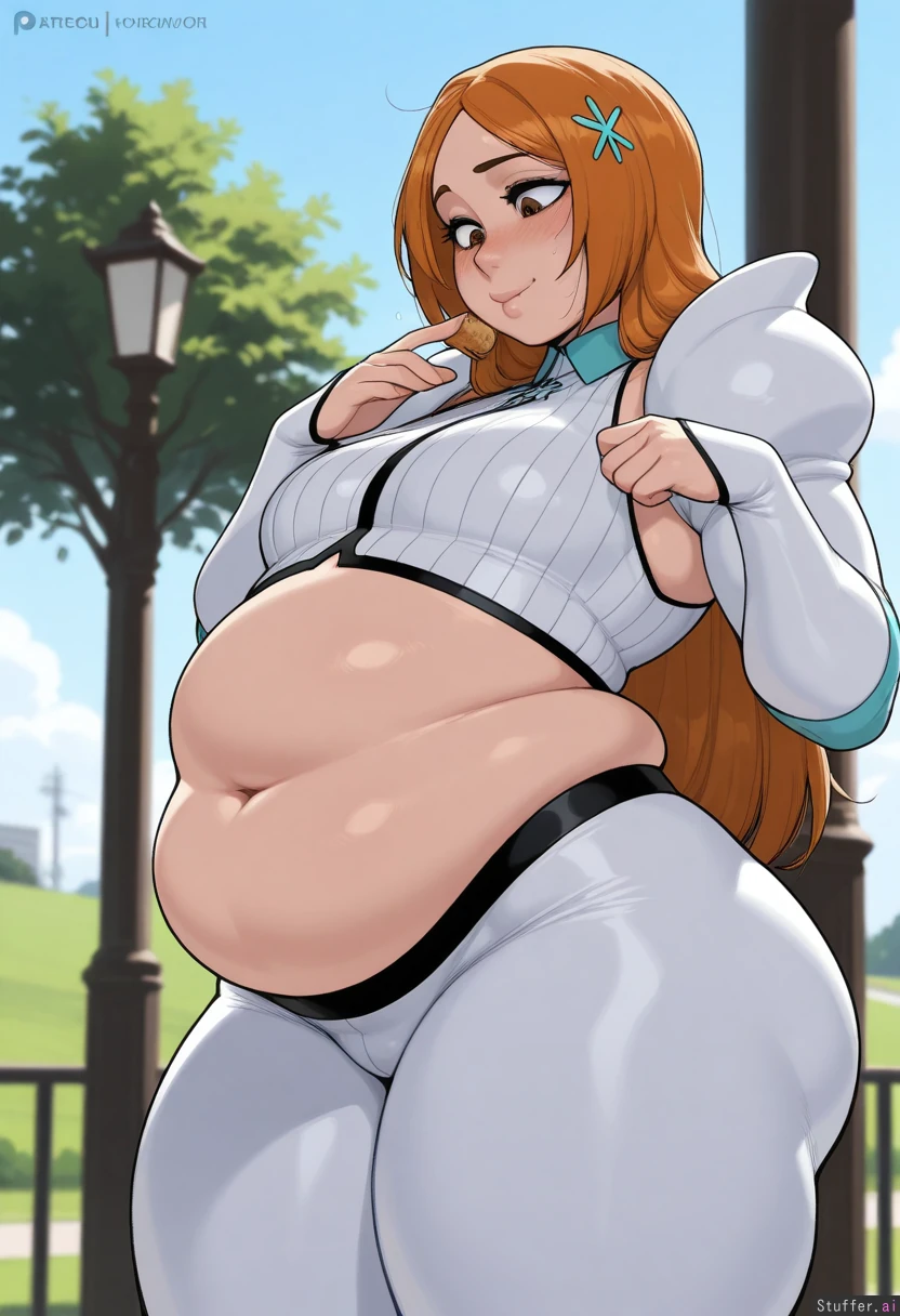 (Krekkov (artist), KAMII MOMORU(artist), KipTeiTei(artist), Vale-City(artist)), beautiful shading, highly detailed, best quality, perfect anatomy, perfect proportions, perfect lighting, solo, ((Inoue_Orihime_Bleach)), (white_arrancar_dress, exposed belly), horny, ((tight clothes)), ((alt girl)), ((thick, chubby_belly:1.39)),((Horny:1.59)), (blushing face), (sexy pose, sexy), thick thighs, shy, round belly, standing, on a park, eating breads, day, big breasts, under clothing, side view, (1flatchest_adult), Dramatic lighting, ((looking down))