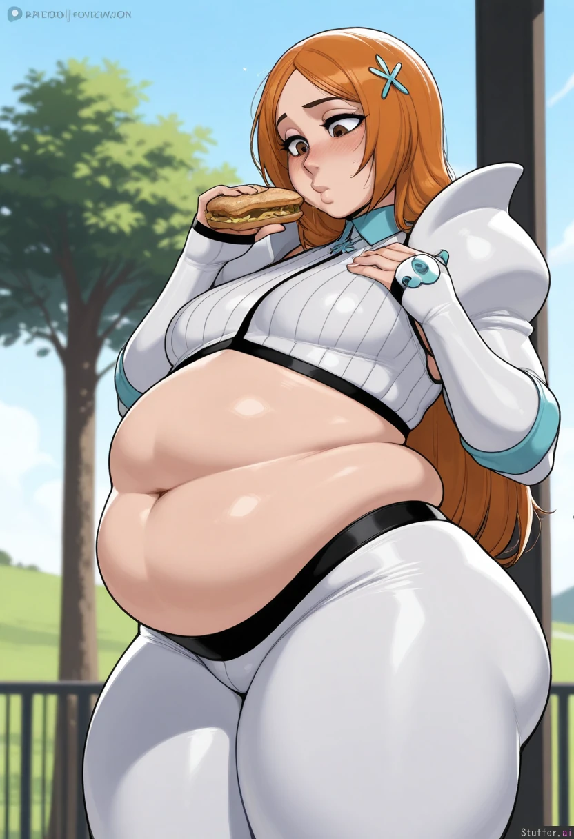 (Krekkov (artist), KAMII MOMORU(artist), KipTeiTei(artist), Vale-City(artist)), beautiful shading, highly detailed, best quality, perfect anatomy, perfect proportions, perfect lighting, solo, ((Inoue_Orihime_Bleach)), (white_arrancar_dress, exposed belly), horny, ((tight clothes)), ((alt girl)), ((thick, chubby_belly:1.49)),((Horny:1.64)), (blushing face), (sexy pose, sexy), thick thighs, shy, round belly, standing, on a park, eating breads, day, big breasts, under clothing, side view, (1flatchest_adult), Dramatic lighting, ((looking down))