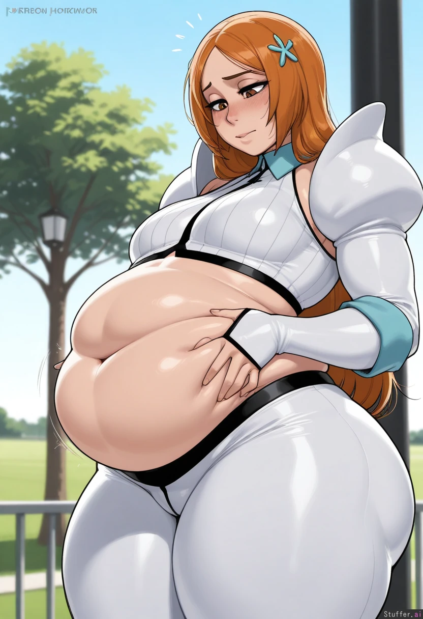(Krekkov (artist), KAMII MOMORU(artist), KipTeiTei(artist), Vale-City(artist)), beautiful shading, highly detailed, best quality, perfect anatomy, perfect proportions, perfect lighting, solo, ((Inoue_Orihime_Bleach)), (white_arrancar_dress, exposed belly), horny, ((tight clothes)), ((alt girl)), ((thick, chubby_belly:1.54)),((Horny:1.64)), (blushing face), (sexy pose, sexy), thick thighs, shy, round belly, standing, on a park, day, big breasts, under clothing, side view, (1flatchest_adult), Dramatic lighting, ((looking down)), grabbing_own_belly, hand_on_belly, felling_sick, nausea