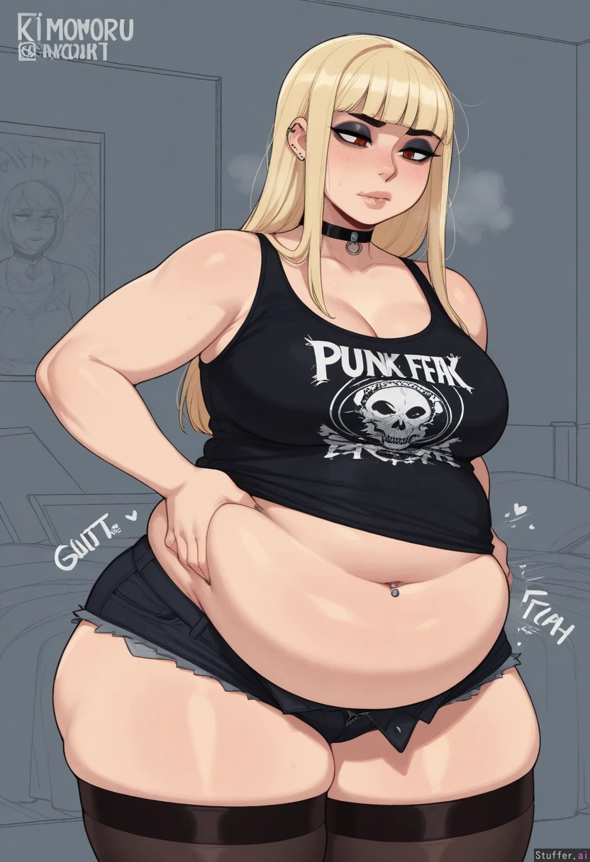 (long blonde hair), blunt bangs, choker, tank top, sleeveless, solo, ((high quality, high detail)), krekkov(artist), KAMII MOMORU(artist), (detailed face), (eyeliner), (((punk))), (navel piercing), (((midriff peek))), (unzipped shorts), thigh highs, (((gf getting fat, weight gain fetish, bottom heavy))), messy bedroom, (exposed hips)