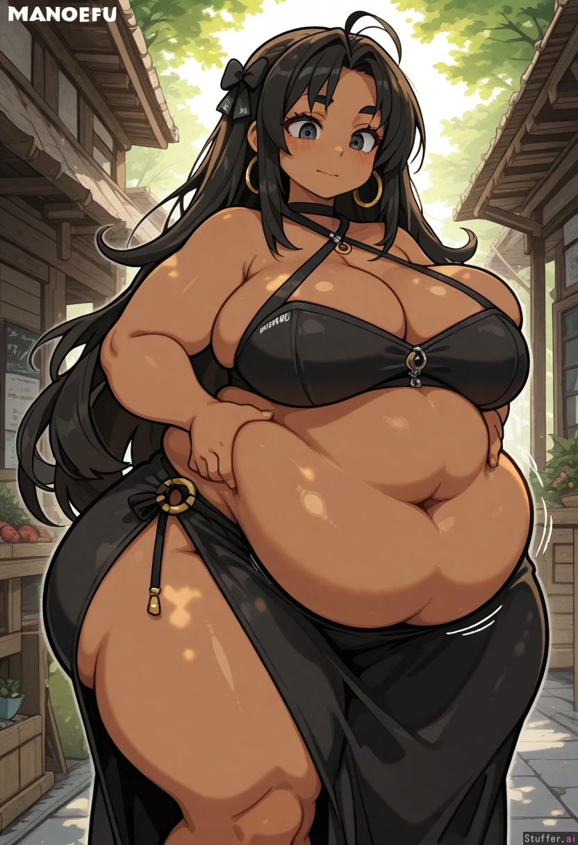 **base** realistic lighting, clean outlines, solo **artist** nancou(artist) **character** native amazonian, 25 years old, dark skin, long flowing hair, detailed belly button, hairbows, pubic hair, heavy blush **clothes** lowleg long tight skirt, sideboob halter top, hoop earrings **settings** wide eyes looking at her belly, downtown garden, dappled sunlight, outdoor gift shop, **body** (((((Massive plump thighs))))), (((((hyper wide hips))))), ((((huge fat love handles)))), ((((huge fat deep navel)))), (hyper massive bottom heavy), (wide plump waist), ((body weight gain expansion)), sagging belly, (huge fat ass), (fat legs), (fat arms), chubby face, massive body expansion