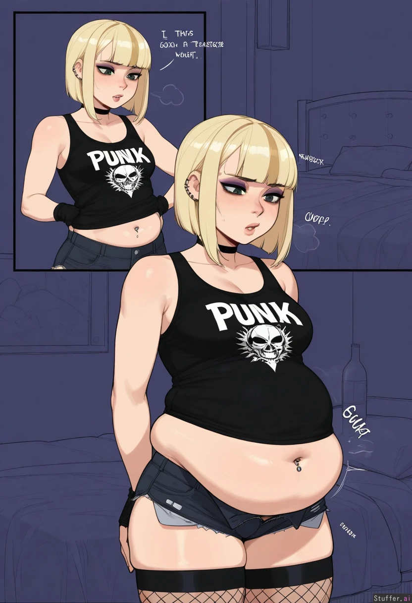 (long blonde hair), blunt bangs, choker, tank top, sleeveless, solo, ((high quality, high detail)), krekkov(artist), KAMII MOMORU(artist), (detailed face), (eyeliner), (((punk))), (navel piercing), (((midriff peek))), (unzipped shorts), thigh highs, (((weight gain fetish, bottom heavy))), messy bedroom, (burping), beer bottles, (((weight gain sequence, skinny girl gets fat)))