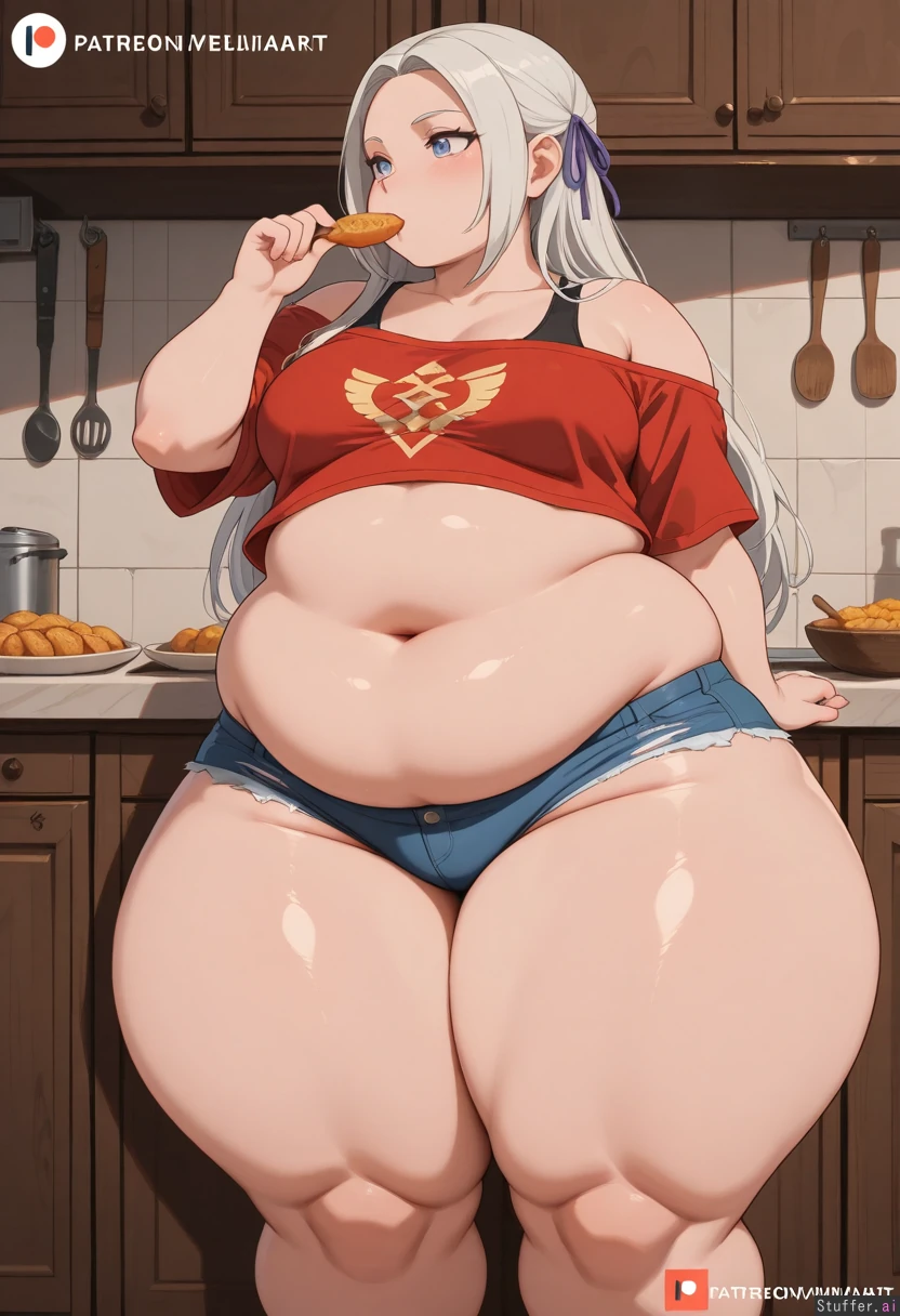 Solo, miraiart /(artist/), (Flat colors), perfect proportions, flirty, (black toff-shoulder), (blue ripped jean shorts),(edelgard),fire emblem heroes, (cute face, wide eyes), blushing, (chubby body:1.6), medium breasts, (entranced face), (thick thighs:2.1), (wide hips:1.2), (stuffed belly:1.0), much food on table, in the kitchen, breasts bulging out of bra, foreshortening, wide shot, arched backwards, leaning forward, demanding, kitchen counter, side profile, eating,(detailed obese body:1.5),
