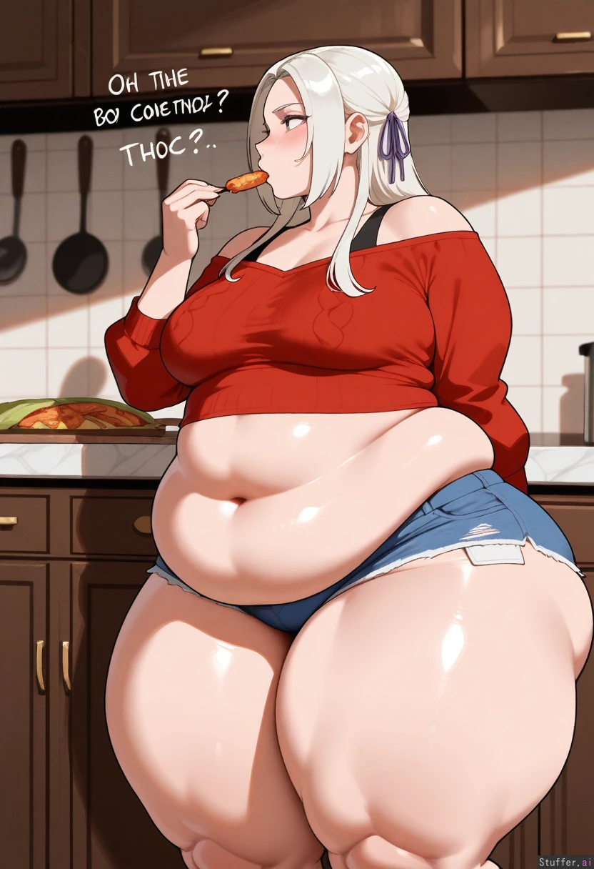 Solo, nyantcha /(artist/), (Flat colors), perfect proportions, flirty, (black toff-shoulder), (blue ripped jean shorts),(edelgard),fire emblem heroes, (cute face, wide eyes), blushing, (chubby body:1.6), medium breasts, (entranced face), (thick thighs:2.1), (wide hips:1.2), (stuffed belly:1.0), much food on table, in the kitchen, breasts bulging out of bra, foreshortening, wide shot, arched backwards, leaning forward, demanding, kitchen counter, side profile, eating,(detailed obese body:1.5),