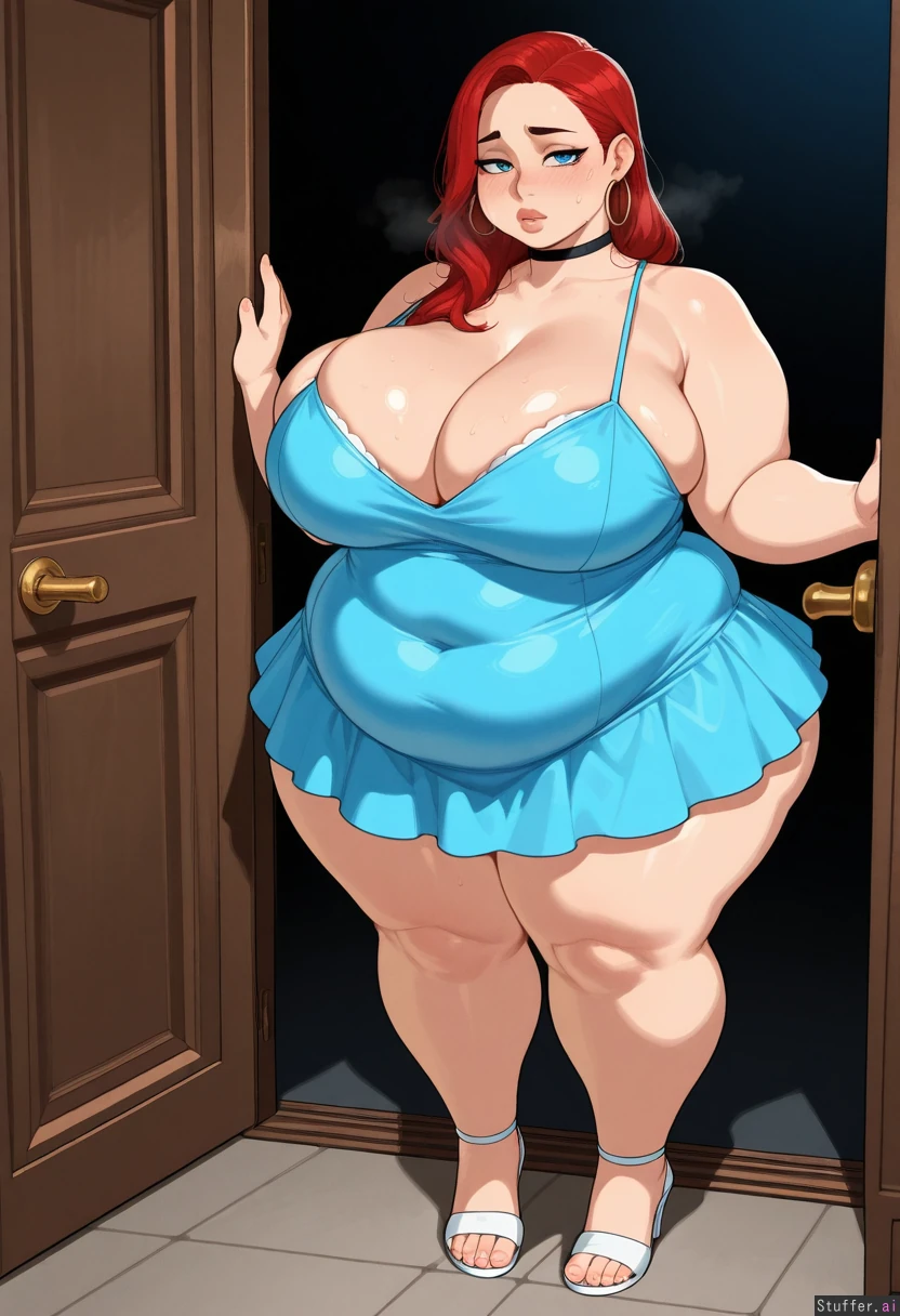 ((Krekkov (artist), KAMII MOMORU(artist), KipTeiTei(artist), Lewdlemage m(artist)), beautiful shading, highly detailed, best quality, perfect anatomy, perfect proportions, perfect lighting, (best quality), (high rating), absurd res, high res, detailed, ultra quality, ((high quality)), masterpiece, (ultra high resolution), anime style, stunning beauty, detailed face, intricate detail, sophisticated detail,, (()), exquisite detail, absurd resolution, correct anatomy, 8k, (highly detailed face), highly detailed skin texture, ((In a bedroom. Dark lighting)),. ((.)). ((Worried expression)) ((quiet)) red cheeks. Super embarrassed. Raised eyebrows. ((Standing in the doorway)). thick lips, inflated lips ((Obese body)). Head down. Black choker. Solo, chubby hands. Obese body. Wide chubby belly. (Fat double chin) swollen face Thick flabby Fat arms. Huge soft doughy arms. Obese heavy Love handles. Obese hips. Long thick side swept Red hair, red middle part hair. Thick fat rolls. Deep heavy bulging cleavage slipping around her bra. Gold hoop earrings. Sea blue prom dress. White strapped heels, beautiful bright blue eyes.. Belly exposed. Fat belly. Huge muffin top Sweating. Huge ass cheeks. Heavy ass. Legs beginning to swell. Inflated legs. Obese legs. Obese hips. .obese feet