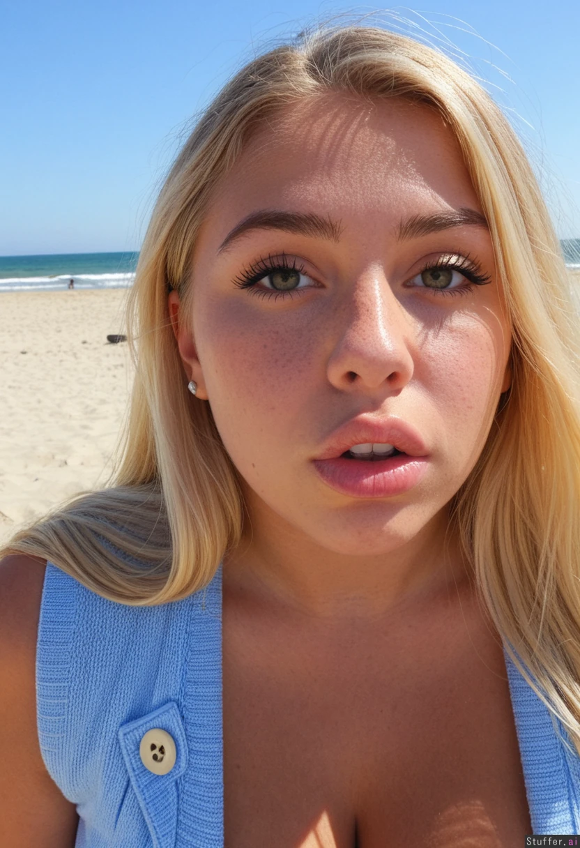 20 year old girl at beach on sunny day, (((very big lips))), (big round eyes), blonde hair, button nose, tanned skin, make-up, curvy