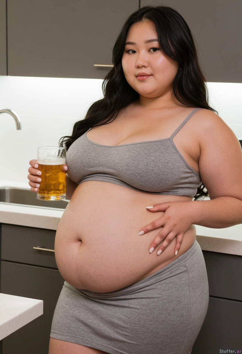 21 year old korean female, 1girl, stunning, tan skin, long wavy black hair, white nails, perfect chubby face, skinny, large breasts, slim waist, wide hips, extremely tight long gray dress (spaghetti straps) modern kitchen, front view leaning on counter, holding giant beer mug Chubby thick flabby body Big Chubby flabby belly (body fat:1.4)