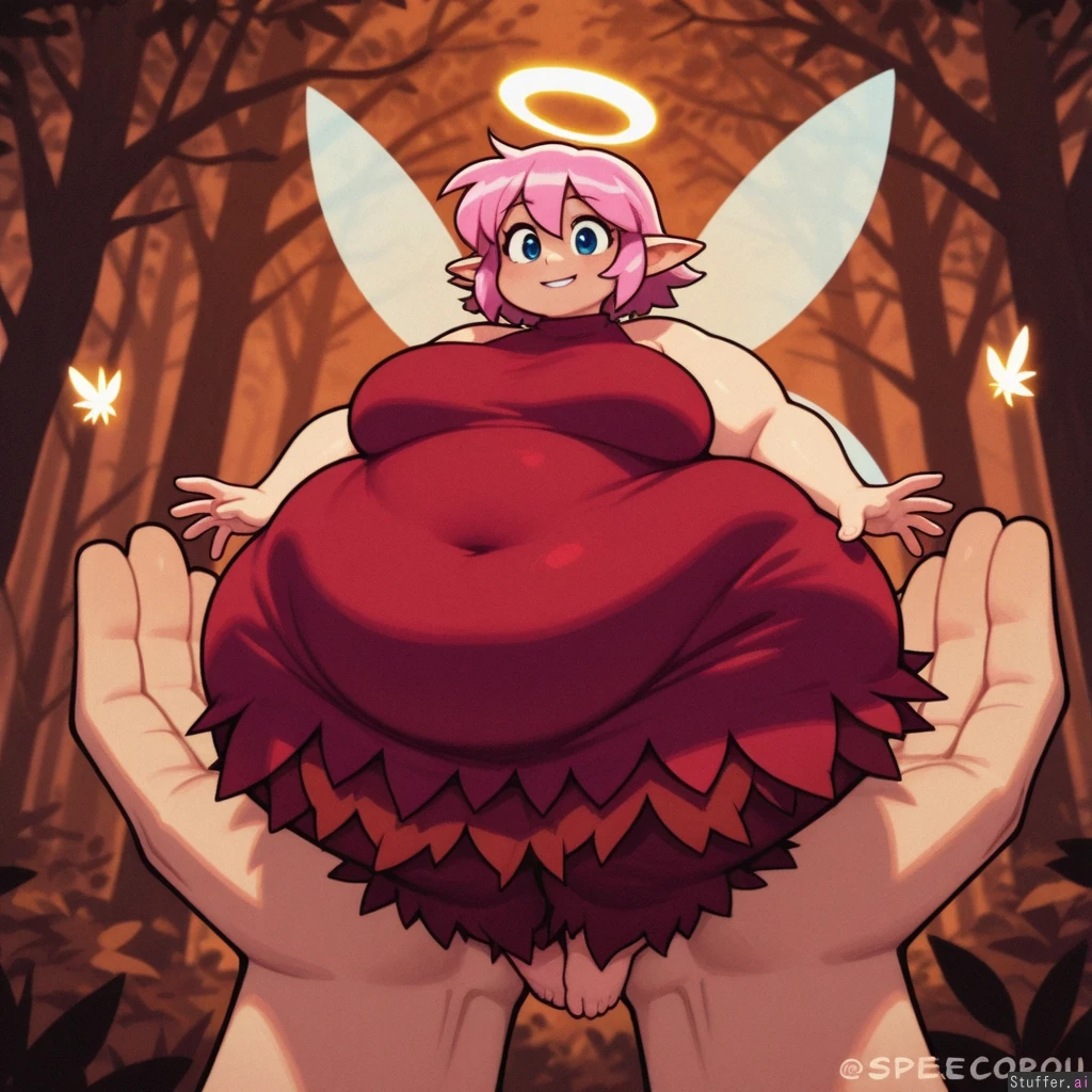 Speedoru(artist), wamudraws(artist), kipteitei(artist), perfect hands, perfect proportions, best_quality, fairy, pink hair, red dress, floating, morbidly_obese, gigantic_ass, minifemale, dark autumn forest.