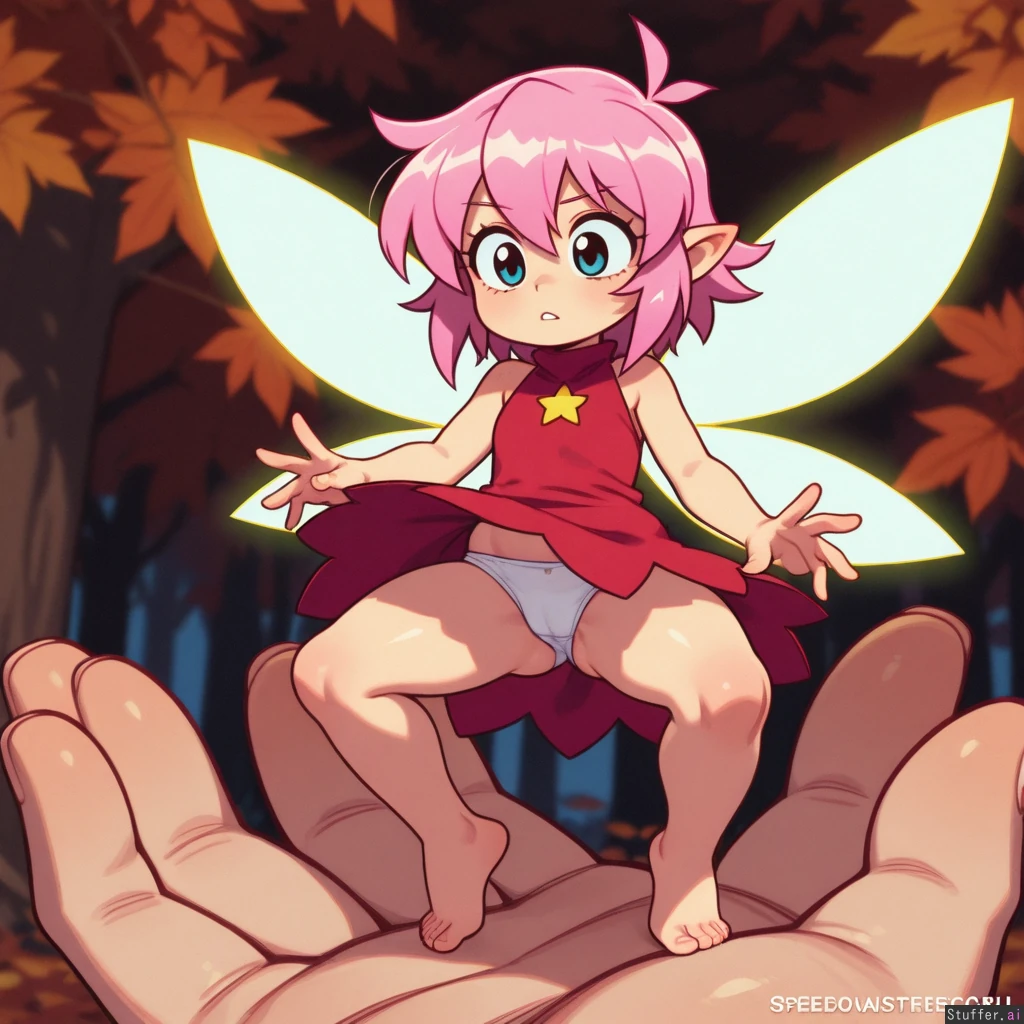 Speedoru(artist), wamudraws(artist), kipteitei(artist), perfect hands, perfect proportions, best_quality, fairy, pink hair, red short dress, white panties, floating, morbidly_obese, gigantic_ass, wind_lift, (minifemale:1.7), dark autumn forest.