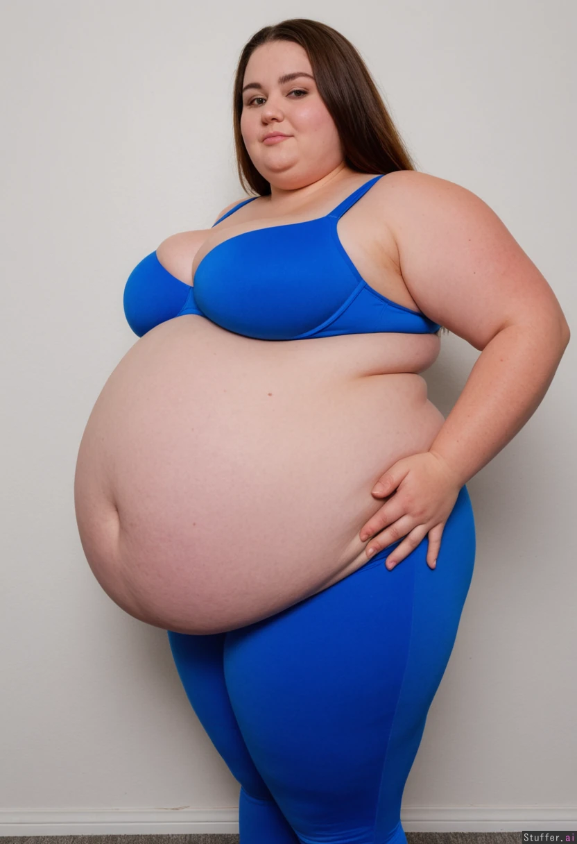 (Side view) Full body view (Massive extremely wide hips:1.6) (Pregnant belly, deep bellybutton:1.3) (Massive extremely gigantic overfilled overflowing huge biggest very tight cleavage:1.6) Blue too tight bra Blue leggins ((Morbidly obese overstuffed blob:1.8))