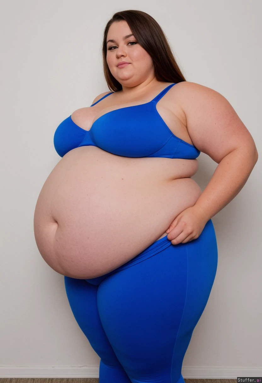 (Side view) Full body view (Massive extremely wide hips:1.8) (Pregnant belly, deep bellybutton:1.3) (Massive extremely gigantic overfilled overflowing huge biggest very tight cleavage:1.8) Blue too tight bra Blue leggins ((Morbidly obese overstuffed blob:1.8))