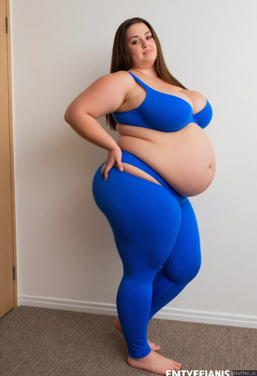 (Side view) Full body view (Massive extremely wide hips:1.8) (Pregnant belly, deep bellybutton:1.3) (Massive extremely gigantic overfilled overflowing huge biggest very tight cleavage:1.8) Blue too tight bra Blue leggins ((Morbidly obese overstuffed blob:1.8))