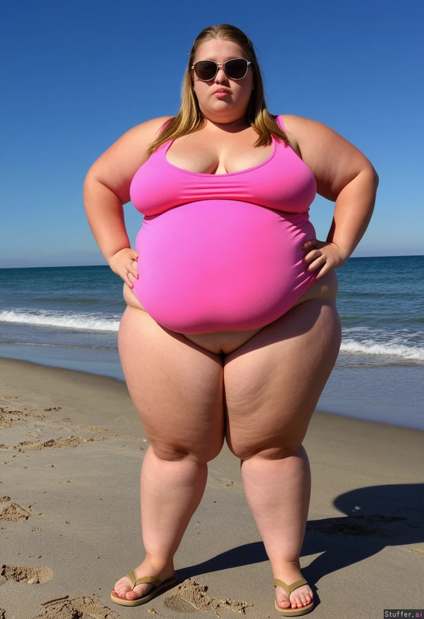20 year old girl, beach on sunny day, brown blonde hair, sunglasses, tight pink tank top, tan lines, huge puffy lips, wide hips, ((massive thighs)), standing in sun, wearing sandals, ((small perky breasts)), ((morbidly obese ssbbw))
