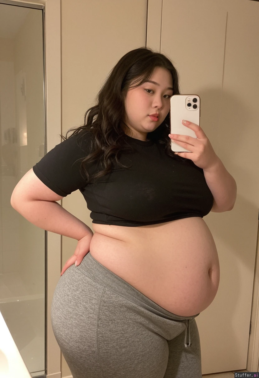 SSBBW 20 year old korean, extremely attractive influencer face bathroom mirror selfie, photorealistic, curvy thick figure, soft round belly, long black wavy hait in middle part, tight black t shirt, tight grey track pants, warm lighting, cozy bathroom background, relaxed pose holding phone up high, realistic skin texture, full body side angle. extremely obese round belly, perfect hands, huge breasts