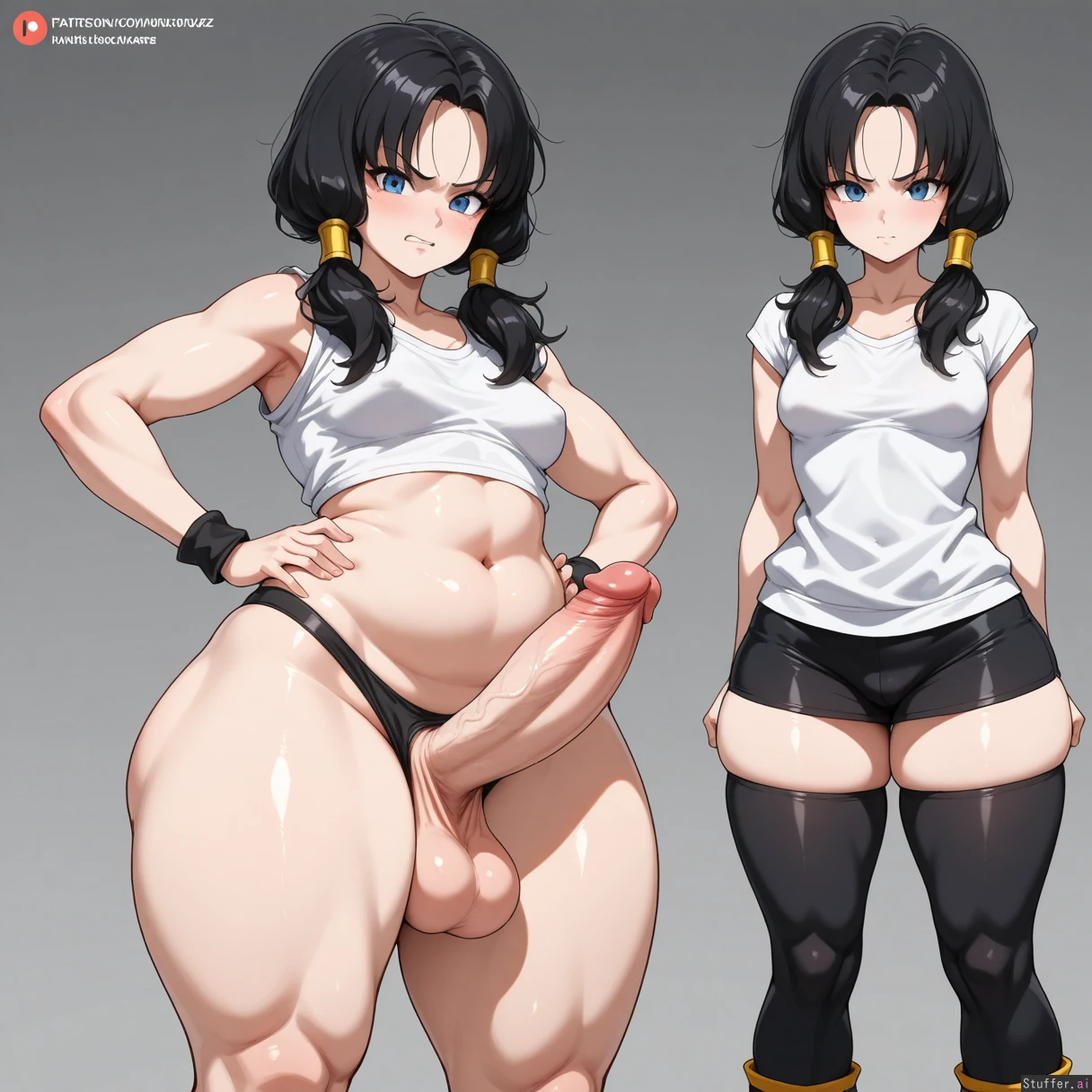 (1_woman) Adult (((videl))) ((Videl from dragonballz)) with the fattest cock ((Massive_thighs, thick_thighs:2, fat_thighs, wide_hips)) Massive horse cock Angry, strong, intimidating (thick_futanari_horse_cock) Pose: holding giant dick (Athletic, small_breasts)