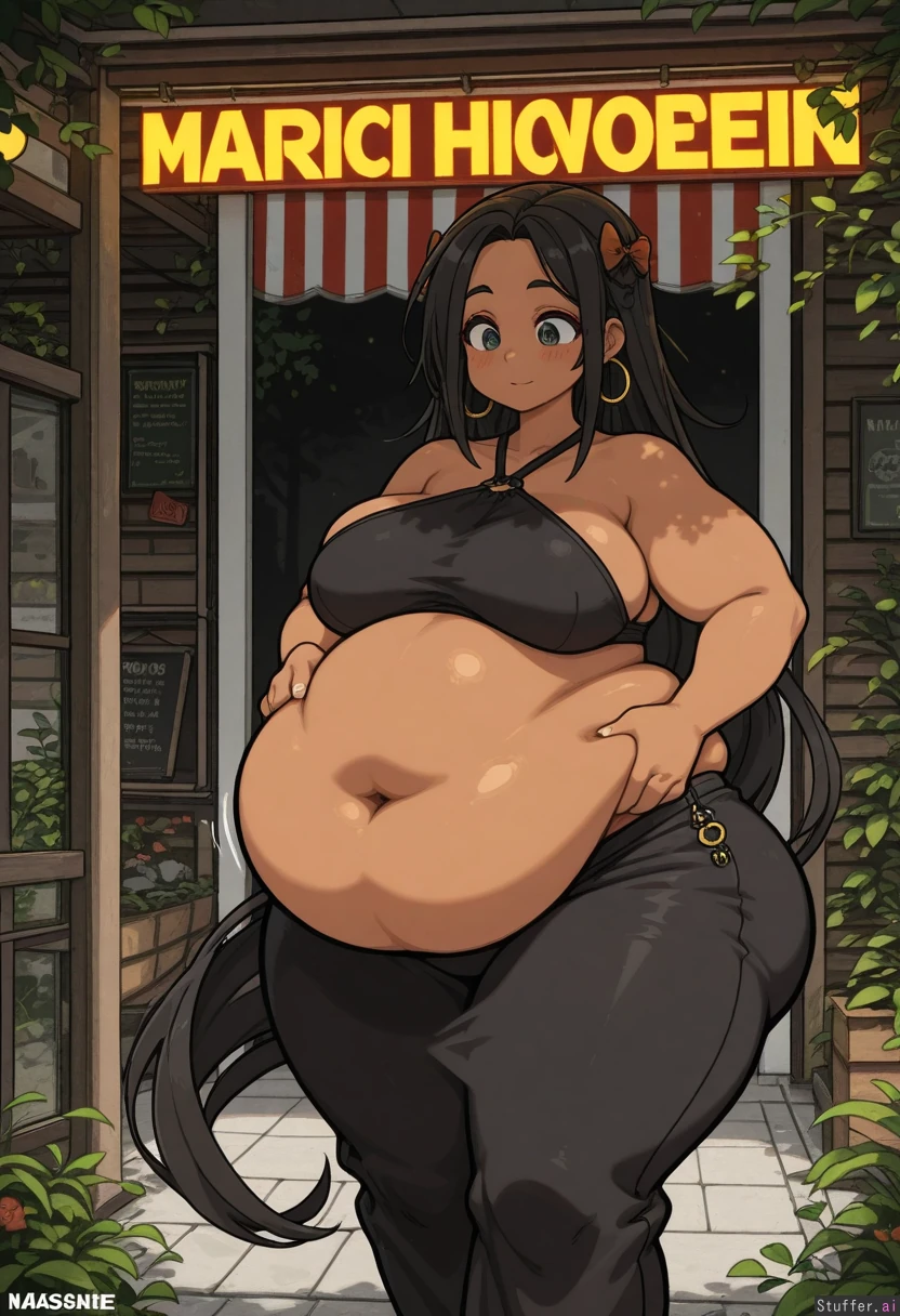 **base** realistic lighting, clean outlines, solo **artist** nancou(artist) **character** native amazonian, 25 years old, dark skin, long flowing hair, detailed belly button, hairbows, heavy blush **clothes** lowleg long tight skirt, sideboob halter top, hoop earrings **settings** wide eyes looking at her belly, downtown garden, dappled sunlight, outdoor gift shop, **body** (Massive plump thighs:1.4), (hyper wide hips:1.4), (huge fat love handles:1.3), (huge fat deep navel:1.3), (hyper massive bottom heavy), (wide plump waist), (body weight gain expansion:1.1), sagging belly, (huge fat ass), (fat legs), (fat arms), chubby face, massive body expansion
