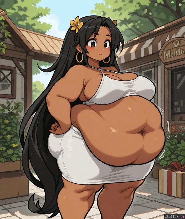 **base** realistic lighting, clean outlines, solo **artist** nancou(artist) **character** native amazonian, 25 years old, dark skin, long flowing hair, detailed belly button, hairbows, heavy blush **clothes** lowleg long tight skirt, sideboob halter top, hoop earrings **settings** wide eyes looking at her belly, downtown garden, dappled sunlight, outdoor gift shop, **body** (Massive plump thighs:1.4), (hyper wide hips:1.4), (huge fat love handles:1.3), (huge fat deep navel:1.3), (hyper massive bottom heavy), (wide plump waist), (body weight gain expansion:1.1), sagging belly, (huge fat ass), (fat legs), (fat arms), chubby face, massive body expansion