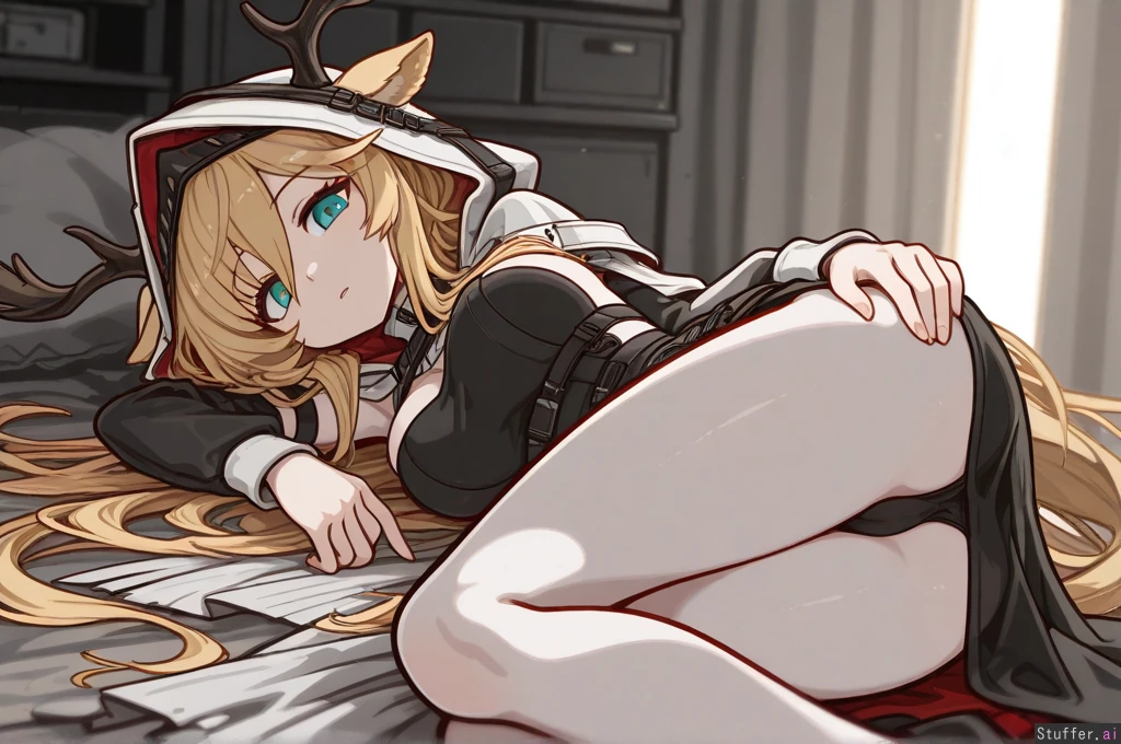 **base** absurdres, best_shading, warm_lighting, best_quality, masterpiece, solo, high_resolution, high_rating **artist** (nancou) **character** Viviana_Droste(arknights), laying, antlers, **settings** rear_view, dappled sunlight **body** (Tall:1.4), long_legs, ((Wide_hips), (gigantic_breasts), (gigantic_ass), (gigantic_thighs), (morbidly_obese_female), (love_handles), (cellulite), (Fat_arms), (fat_legs), :0.1),