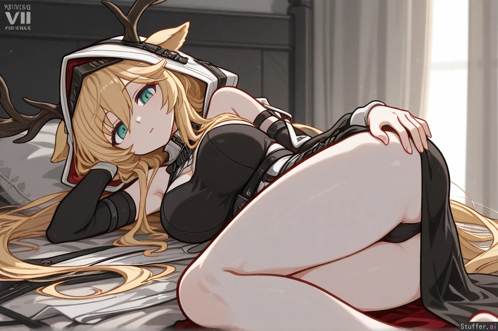 **base** absurdres, best_shading, warm_lighting, best_quality, masterpiece, solo, high_resolution, high_rating **artist** (nancou) **character** Viviana_Droste(arknights), laying, antlers, **settings** rear_view, dappled sunlight **body** (Tall:1.4), long_legs, ((Wide_hips), (gigantic_breasts), (gigantic_ass), (gigantic_thighs), (morbidly_obese_female), (love_handles), (cellulite), (Fat_arms), (fat_legs), :0.4),