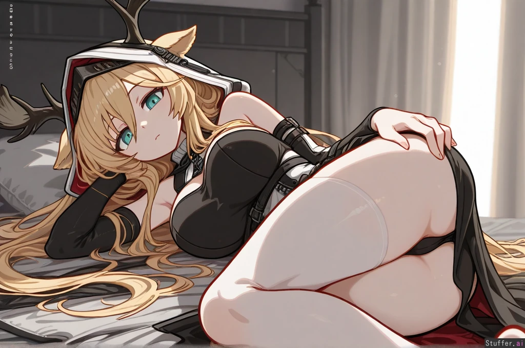 **base** absurdres, best_shading, warm_lighting, best_quality, masterpiece, solo, high_resolution, high_rating **artist** (nancou) **character** Viviana_Droste(arknights), laying, antlers, **settings** rear_view, dappled sunlight **body** (Tall:1.4), long_legs, ((Wide_hips), (gigantic_breasts), (gigantic_ass), (gigantic_thighs), (morbidly_obese_female), (love_handles), (cellulite), (Fat_arms), (fat_legs), :0.5),