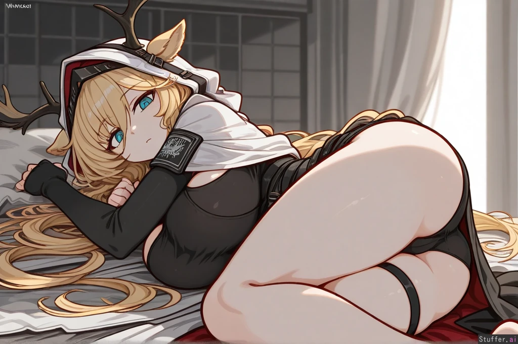 **base** absurdres, best_shading, warm_lighting, best_quality, masterpiece, solo, high_resolution, high_rating **artist** (nancou) **character** Viviana_Droste(arknights), laying, antlers, **settings** rear_view, dappled sunlight **body** (Tall:1.4), long_legs, ((Wide_hips), (gigantic_breasts), (gigantic_ass), (gigantic_thighs), (morbidly_obese_female), (love_handles), (cellulite), (Fat_arms), (fat_legs), :0.7),