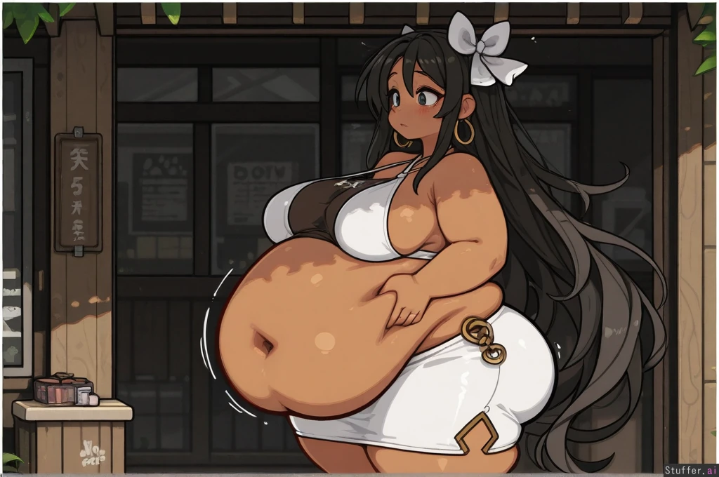 **base** realistic lighting, clean outlines, solo **artist** (nancou) **character** native amazonian, 25 years old, dark skin, long flowing hair, detailed belly button, hairbows, pubic hair, heavy blush, wide eyes looking at her belly, **clothes** lowleg long tight skirt, sideboob halter top, hoop earrings **settings** downtown garden, dappled sunlight, outdoor gift shop, side view **body** (Massive plump thighs:1.4), (hyper wide hips:1.4), (huge fat love handles:1.3), (huge fat deep navel:1.3), (hyper massive bottom heavy), (wide plump waist), (body weight gain expansion:1.1), sagging belly, (huge fat ass), (fat legs), (fat arms), chubby face, massive body expansion