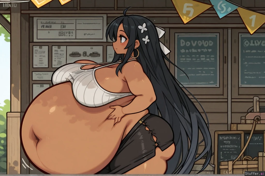 **base** realistic lighting, clean outlines, solo **artist** (nancou) **character** native amazonian, 25 years old, dark skin, long flowing hair, detailed belly button, hairbows, pubic hair, heavy blush, wide eyes looking at her belly, **clothes** lowleg long tight skirt, sideboob halter top, hoop earrings **settings** downtown garden, dappled sunlight, outdoor gift shop, side view **body** (Massive plump thighs:1.4), (hyper wide hips:1.4), (huge fat love handles:1.3), (huge fat deep navel:1.3), (hyper massive bottom heavy), (wide plump waist), (body weight gain expansion:1.1), sagging belly, (huge fat ass), (fat legs), (fat arms), chubby face, massive body expansion