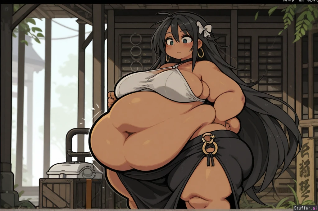 **base** realistic lighting, clean outlines, solo **artist** (nancou) **character** native amazonian, 25 years old, dark skin, long flowing hair, detailed belly button, hairbows, pubic hair, heavy blush, wide eyes looking at her belly, **clothes** lowleg long tight skirt, sideboob halter top, hoop earrings **settings** downtown garden, dappled sunlight, outdoor gift shop, **body** (Massive plump thighs:1.4), (hyper wide hips:1.4), (huge fat love handles:1.3), (huge fat deep navel:1.3), (hyper massive bottom heavy), (wide plump waist), (body weight gain expansion:1.1), sagging belly, (huge fat ass), (fat legs), (fat arms), chubby face, massive body expansion